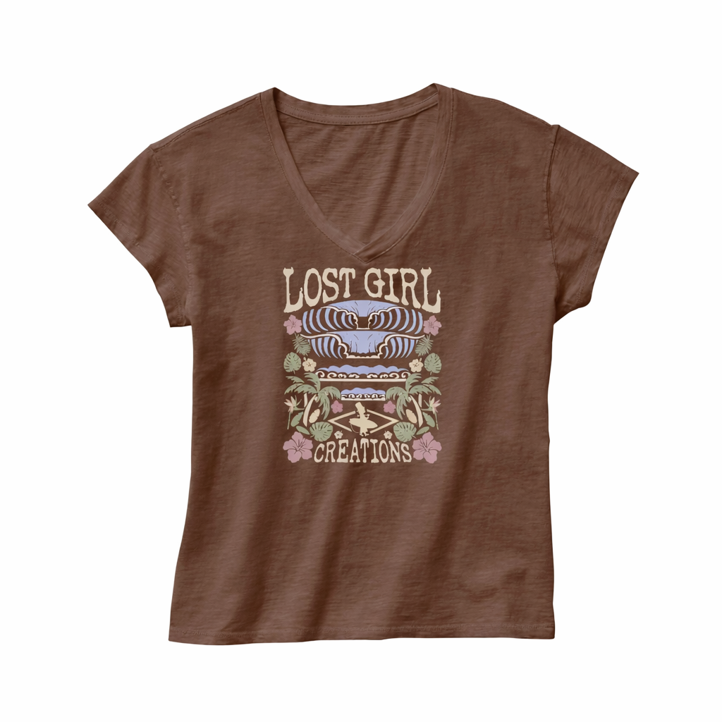 Pigment Died; V-Neck; 1/4 sleeve; Short sleeve; screen print Lost Girl "Tahiti" logo; Salted Caramel Brown; 100% Cotton; Available in S-XXL, See sizing chart on footer