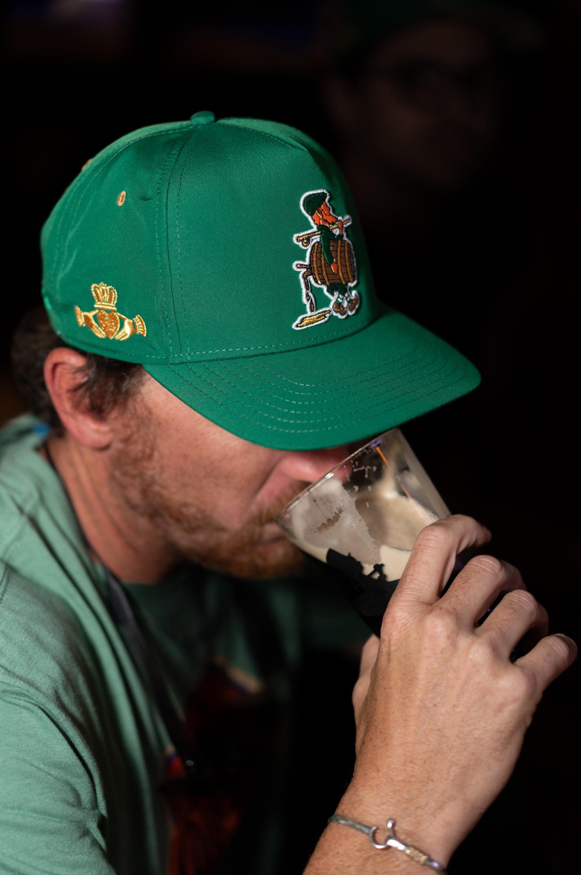 Limited Edition St. Patricks Day hat for 2026. Logo holding whiskey barrel, underbrim printing. claddagh ring, etc. Available on 3/13 at 9 am.