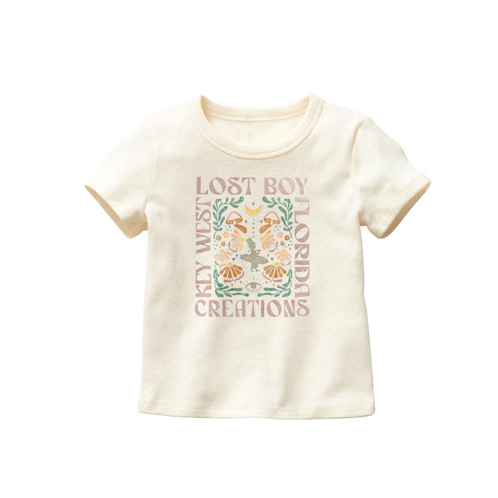 The Day Trippin tee has a petite fit and mellow vibe. The front features our custom Lost Boy Creations print—mushrooms, shells, and a mystical moth, wrapped in a nod to Key West. Designed for a shorter length and slimmer fit, perfect for petite frames.